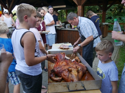 Teilnehmer freuten sich auf die Spanferkel, die eifrig mit einem